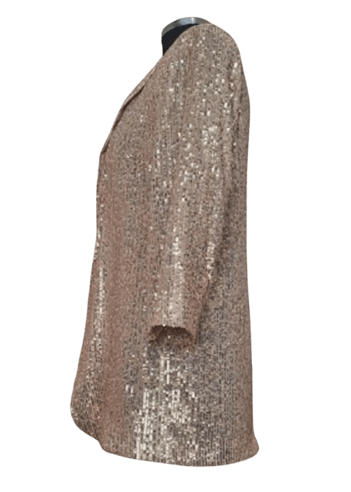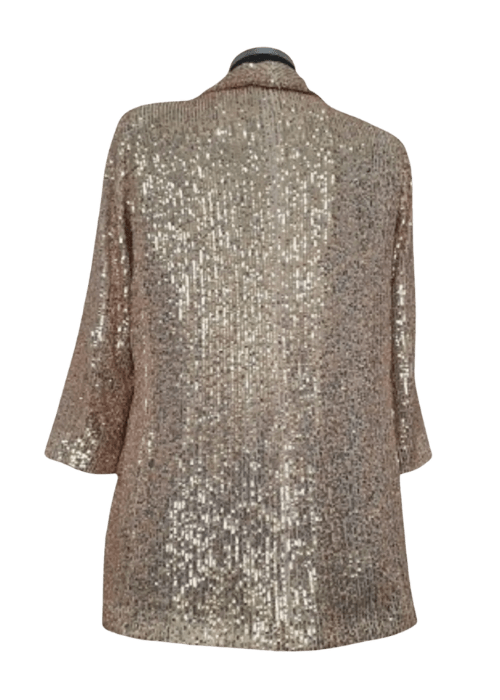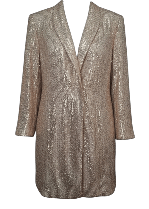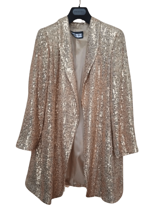 Fabric: Sequin-covered textile with soft satin lapels and full interior lining.