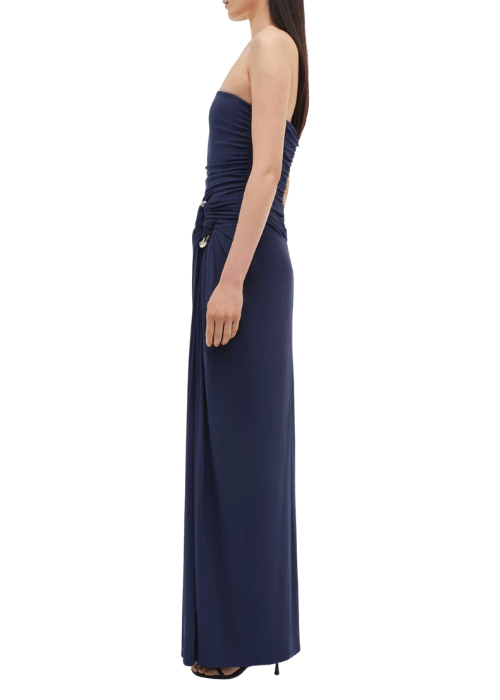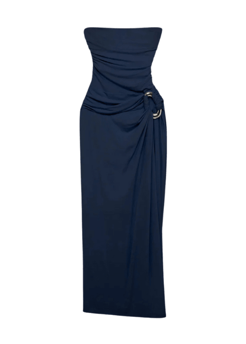 The SIMKHAI Emma Gown in Midnight is the embodiment of refined evening elegance. Tailored from a stretchy tech-fabric (rayon blended with a touch of spandex), this strapless maxi gown features a structured bustier bodice lending architectural precision. A hand-gathered drape cascades from the hip, secured with a sleek metal ring, infusing the design with sculptural movement. The rich “Midnight” hue—a deep, inky blue—makes the piece both sophisticated and modern. With its seamless lines, ring hardware detail, and floor-grazing hem, the gown strikes a balance between minimalism and statement, perfect for gala events or black-tie occasions.