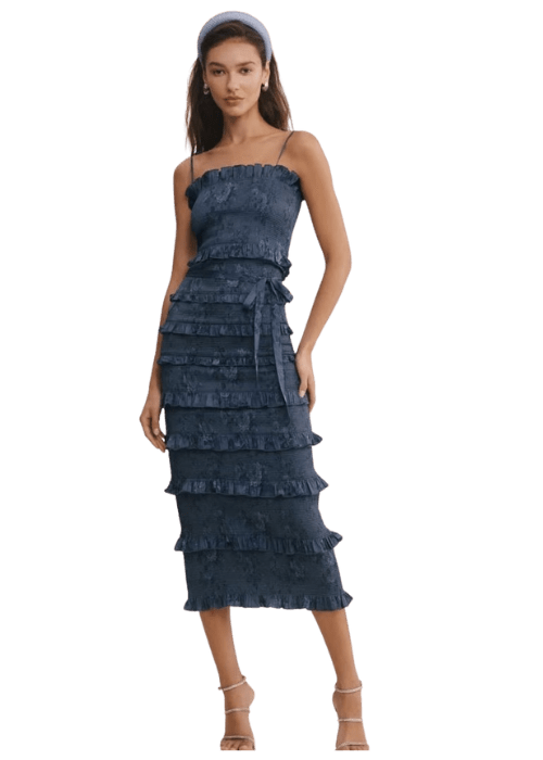 V. Chapman Lily Ruched & Ruffled Stretch Satin Midi Dress