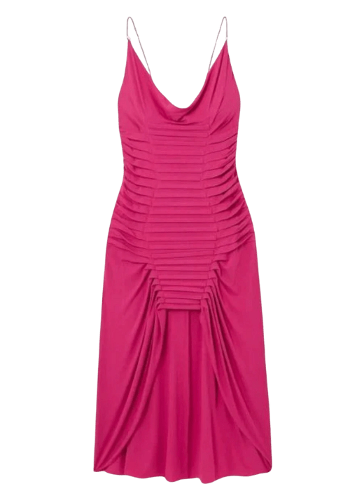 The Dion Lee Ventral Asymmetric Pintucked Draped Jersey Dress in pink showcases the designer’s signature architectural aesthetic. Crafted from soft, stretch jersey, it features intricate pintuck detailing that contours the body, creating a sculptural yet fluid silhouette. The asymmetric hemline and draped construction add movement and edge, while the bold pink hue brings a vibrant, modern feel. Perfect for making a statement at evening events, cocktail parties, or high-fashion gatherings, this piece combines directional design with flattering wearability.