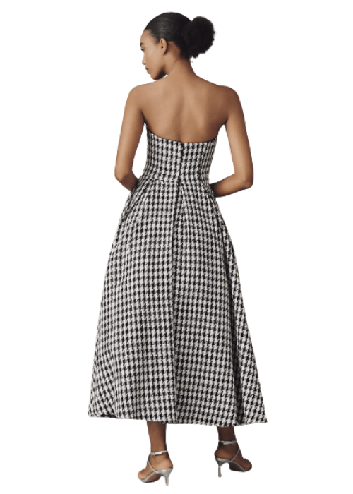 Available for try on in Santa MonicaMac Duggal Strapless 3D Flower Bouclé A-Line Midi Dress