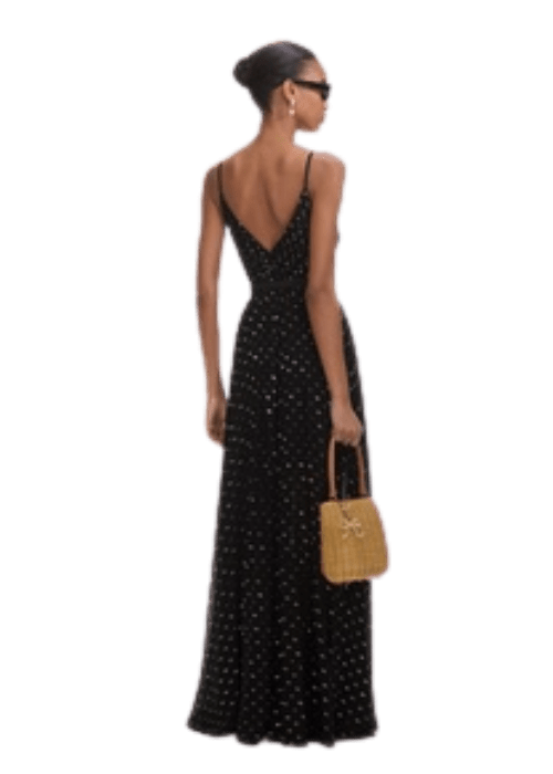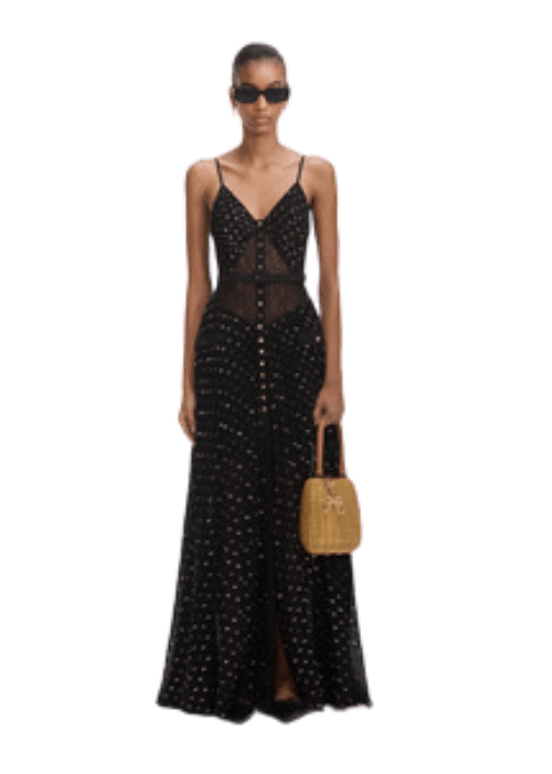 Available for try on in Santa MonicaSelf Portrait Black and Gold Chiffon Maxi Dress