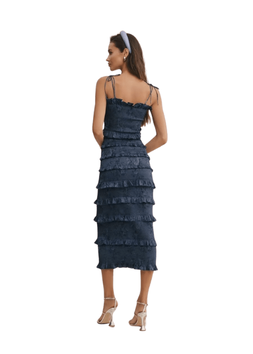 The V. Chapman Lily Ruched & Ruffled Stretch Satin Midi Dress embodies vintage-inspired romance with a modern, feminine edge. Crafted from soft stretch satin, this dress features delicate ruching that flatters the figure and cascades into tiered ruffles, creating a graceful silhouette that moves beautifully. The sweetheart neckline and adjustable shoulder straps enhance its romantic charm, while the fitted bodice and body-skimming skirt evoke effortless sophistication. Perfect for weddings, cocktail parties, and elegant evening events, the Lily Dress is a timeless statement of elegance and confidence.