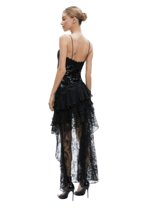 Available for try on in Santa MonicaAlice and Olivia Nelia Sequined High-Low Ruffled Maxi Dress