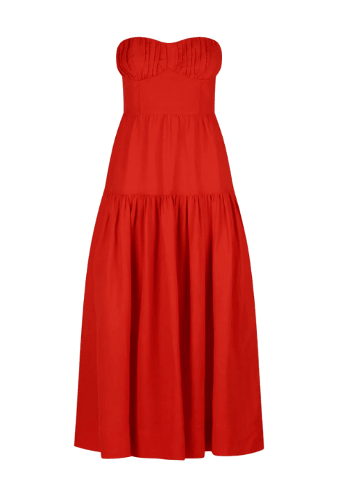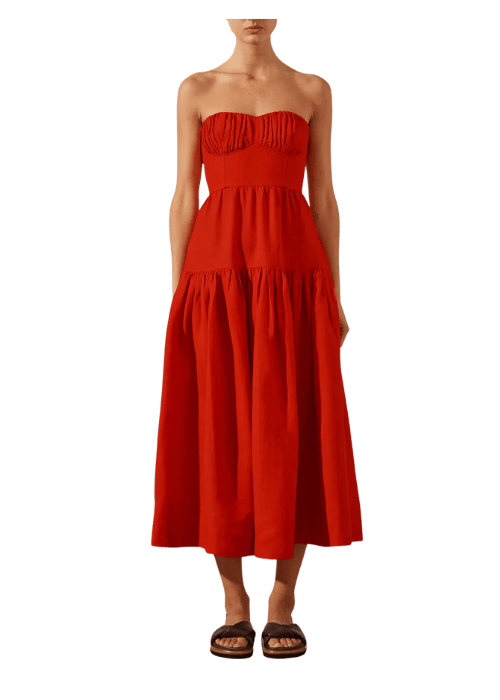 Step into effortless elegance with the Shona Joy Jules Midi Dress in Lipstick Red. Crafted from lightweight, breathable linen, this strapless dress features delicate ruching that flatters the waist and adds dimension to the silhouette. The midi length offers a sophisticated, feminine look, perfect for daytime events, garden parties, summer weddings, or evening soirées. With its vibrant red hue, this dress makes a statement while remaining timeless and versatile—an essential piece for any stylish wardrobe.